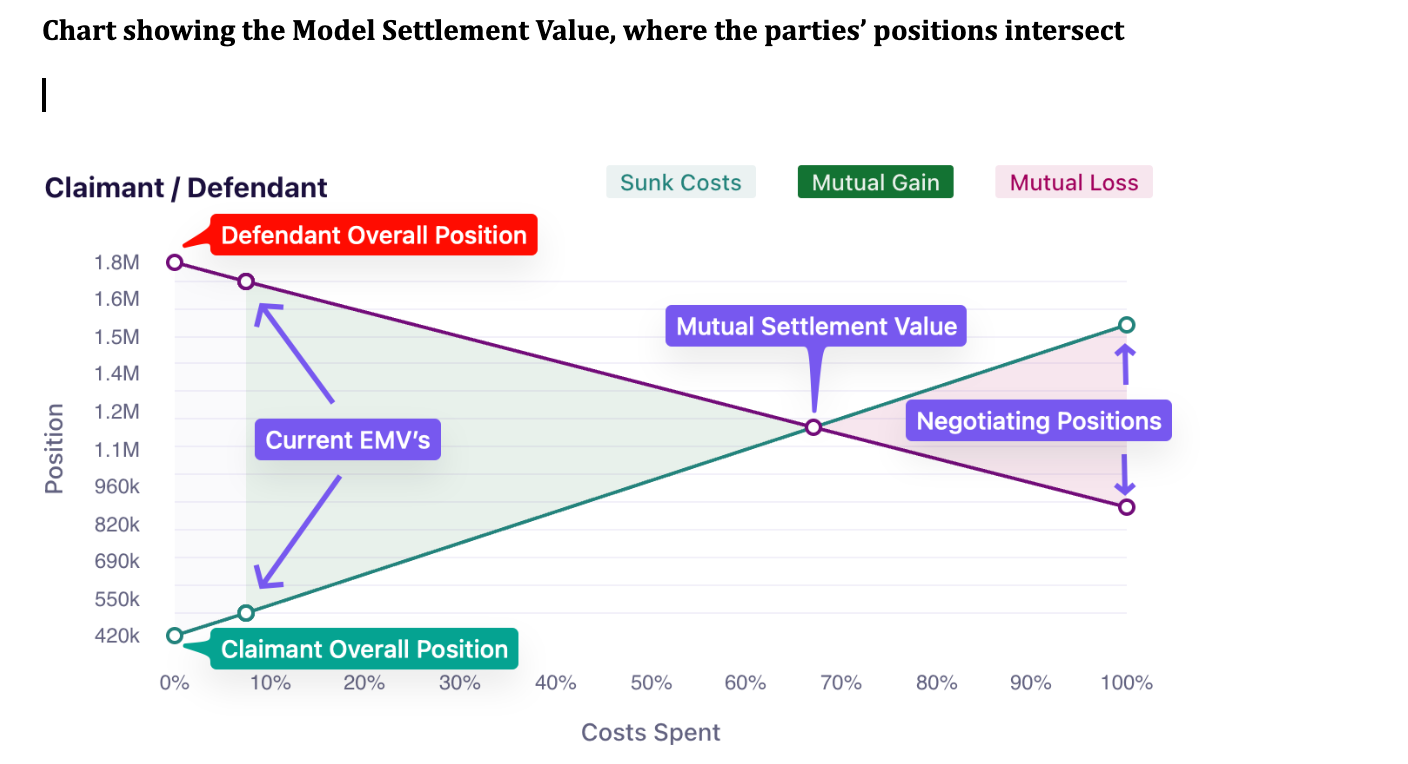 Uniquely SettleIndex calculates your Opponent’s position as well as your own, to counteract bias. It shows the Current range for settlement and, in most cases, the Model Settlement Value; that is, where the Claimant and Defendant risk lines intersect as they spend costs.